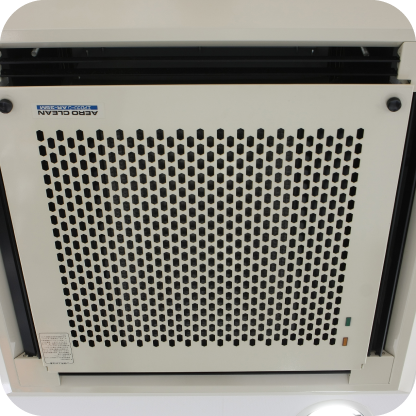 ウィルスなどの飛沫感染を予防するために電気集塵式空気清浄装置エアロシステム35Mを天井に設置し、室内をオペ室同様のクリーンな環境に保っています。空気中を浮遊する0.01um以上の微粒子(ウィルスは約0.1um・スギ花粉約40um)を除去することができます。
