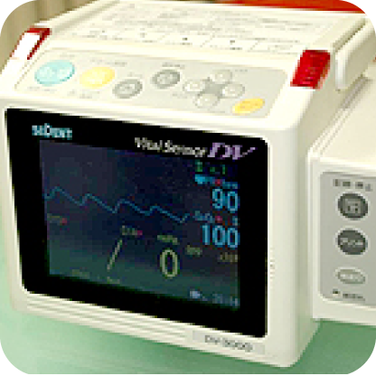 心電図、血圧、脈拍、血中酸素飽和度を確認できる生体情報モニターです。全身疾患のある方でも安心して治療・手術をうけていただけます。